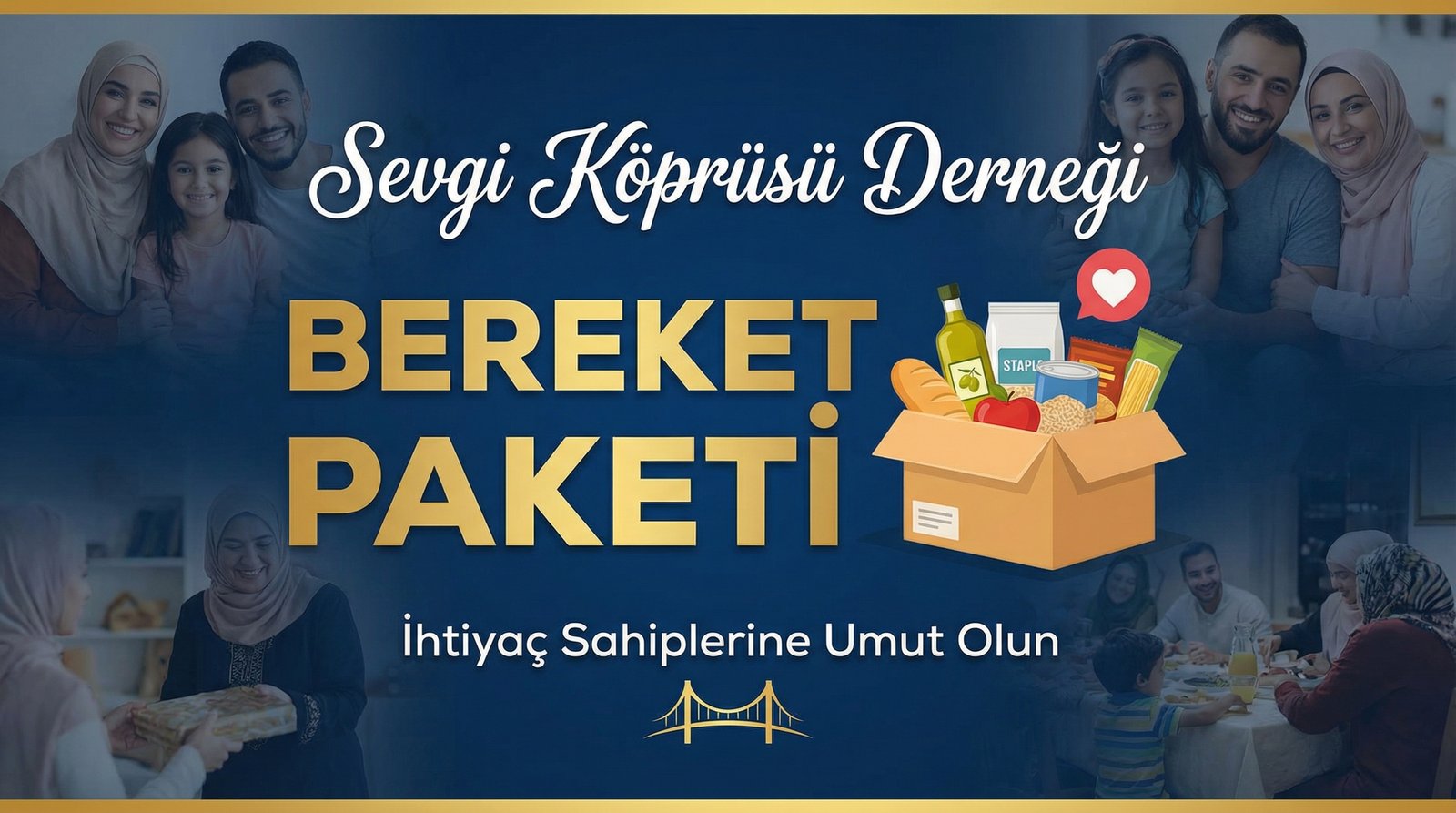 Bereket Paketi – Sevgi Köprüsü Derneği ile ihtiyaç sahibi ailelere 1 aylık temel gıda desteği ulaştırın. Kumanya bağışı ile sofralara bereket, kalplere umut katın. Şeffaf ve güvenilir yardım.